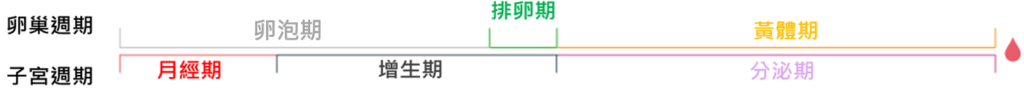 | 0-7 | 月經期: 子宮內膜脫落及排出。 | 卵泡期:卵巢被刺激而產生多個卵泡。每個卵泡都包含一粒未成熟的卵子。最終會有一個卵泡成為主卵泡 (Dominant Follicle),其他卵泡則會停止生長。 |
