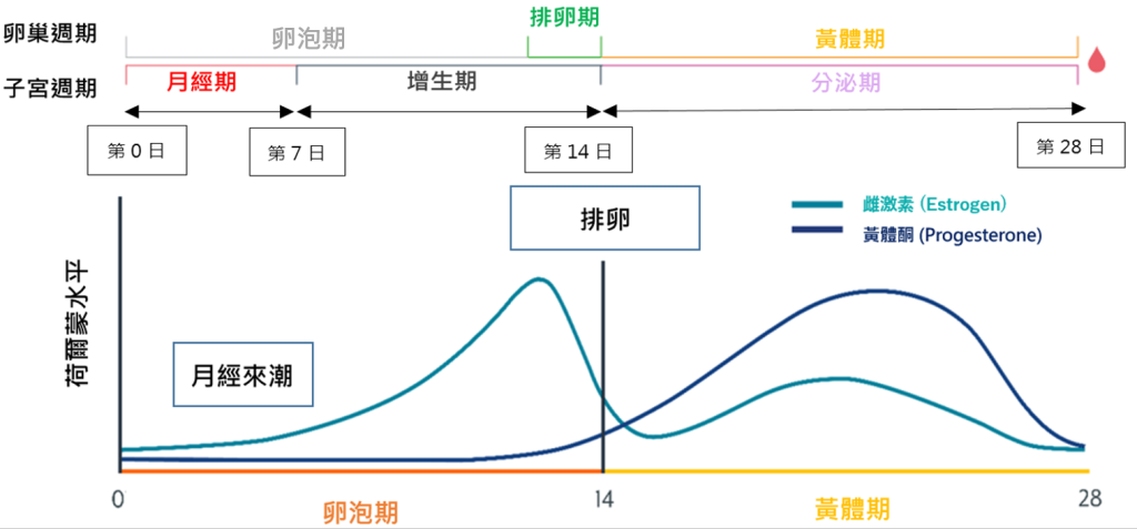週期主要是由荷爾蒙 – 雌激素 (Estrogen) 和黃體酮 (Progesterone) 調節,目的是為懷孕作準備。