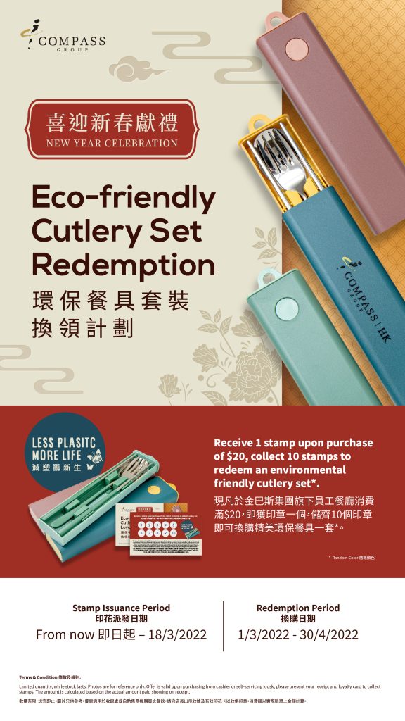 金巴斯一向著重環保,減塑亦是我們在2030年需實現的減排目標之一。有見及此,我地推出【環保餐具套裝換領計劃】,凡於金巴斯集團旗下員工餐廳及咖啡室消費滿$20,即獲印章一個,儲齊10個印章即可換購精美環保餐具一套。優惠期有限,換完即止,大家一齊來為環保出一分力!