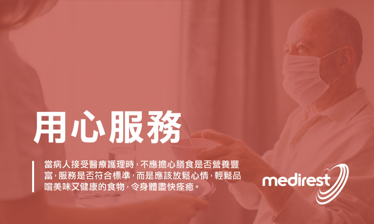 Medirest締造優雅潔淨的環境,為患者提供營養豐富,開胃可口的餐食,輔助病人恢復體力,讓身體慢慢康復,同時亦為醫院的人員及訪客提供美味的餐飲,令他們身心健康,時刻保持健康,體力充沛。